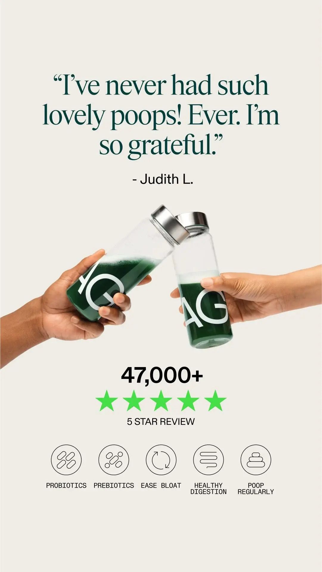 How it’s used: The ad opens with “Painful poops / Weird poops / Hard poops / Loose poops / Infrequent poops” — all crossed out in neon, visually showing elimination of issues. Then it lands on “Regular poops” as the simple, desirable outcome. The brain sees a messy problem set → instantly craves the promised resolution.