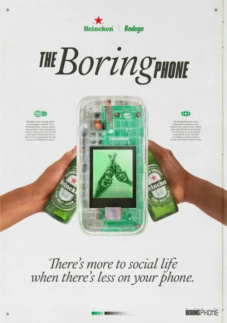 Heineken names their “product” (“The Boring Phone”), but makes it a deliberately unappealing name so you pause. Then it reframes boring as better: fewer distractions, more real social interaction.
