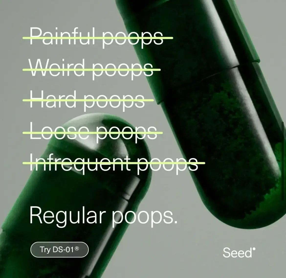 Seed wins by showing your exact gut struggles, crossing them out to give visual relief, and then dropping a single, clean solution (“Regular poops”) that feels simple, certain, and science-backed — all while using a bit of cheeky honesty to stop the scroll.
